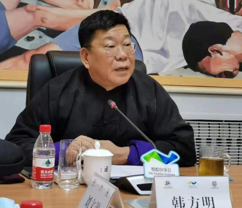 圖為(wei) 2019年韓方明榮譽會(hui) 長出席在北京適園召開的察哈爾口岸貿易文化座談會(hui) 並在會(hui) 上講話。