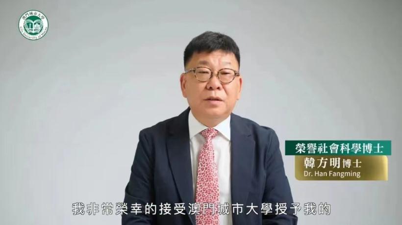 為(wei) 表彰韓方明博士對國家外交和公共外交事業(ye) 的貢獻和對相關(guan) 專(zhuan) 業(ye) 領域的高等教育貢獻,特別是對澳門城市大學發展的卓越貢獻,現在恭請校董會(hui) 主席陳明金博士、校長劉駿教授,頒予韓方明博士榮譽社會(hui) 科學博士學位,請在場的諸位共同見證這個(ge) 屬於(yu) 韓方明博士和澳門城市大學的共同榮耀。