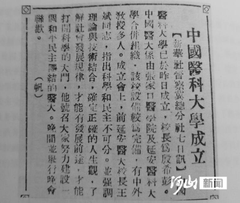 《晉察冀日報》報道中國醫科大學在張家口成立的消息。(張家口市檔案館藏)