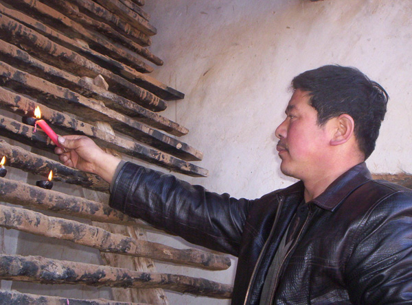 上世紀七十年代末,郭建明還在上小學時,就開始接觸“拜燈山”民俗社火的製作和祭拜活動,跟著長輩們(men) 跑前跑後。有時大人們(men) 嫌他礙手礙腳,免不了打幾下罵幾句讓他躲開,但他就是不離藝人們(men) 左右,好像對“拜燈山”這一古老的民俗社火有一種別樣的情感。這也難怪,郭建明的曾祖父郭穩,就是清末民初村裏有名的“拜燈山”藝人,能把200多隻燈盞在燈山樓內(nei) 的木架上擺出各種圖案。1940年後,郭建明的曾祖父把“拜燈山”這一民俗技藝傳(chuan) 給了他的祖父郭為(wei) 財,建國後,爺爺又傳(chuan) 給了郭建明的堂叔郭淼。可能是家族的影響,從(cong) 小郭建明就對“拜燈山”民俗社火特別癡迷。
