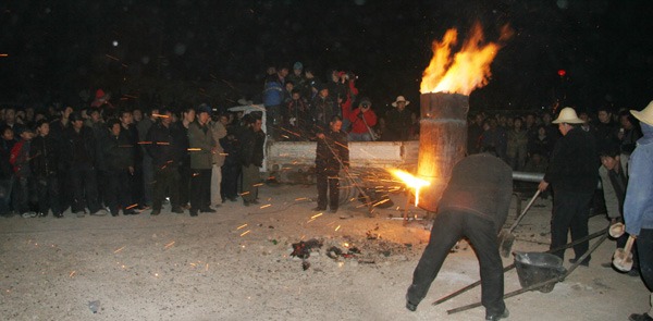 打樹花的技術傳(chuan) 承到現在是第八代了,其代表性傳(chuan) 承人是薛建國。薛建國,男,鑄造工,河北省蔚縣暖泉鎮北官堡村人。1972年出生,12歲跟父親(qin) 學藝,18歲初中畢業(ye) 後在本鎮自家創辦的鑄造廠裏跟隨爺爺和父親(qin) 幹起了鑄造行業(ye) 。