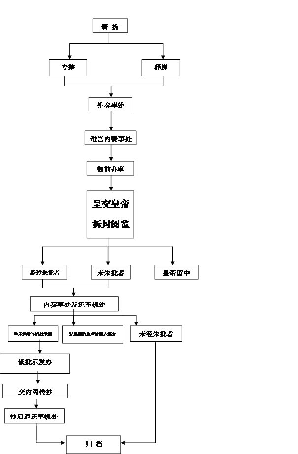 清製,凡是奏折內(nei) 容皇帝認為(wei) 不宜宣泄者,由皇帝交禦前侍衛留在宮中;其餘(yu) 奏折由內(nei) 奏事退交軍(jun) 機處。軍(jun) 機處接到奏折後,凡有朱批者須即刻發還原具奏者遵辦。在交還本人前,由軍(jun) 機處專(zhuan) 門負責管理檔案的滿漢文檔房的抄寫(xie) 筆帖式謄抄,折內(nei) 各處朱筆批示,均要照錄,經專(zhuan) 人校對無誤後,與(yu) 當日皇帝閱後未經朱筆批示的奏折,一並留存。