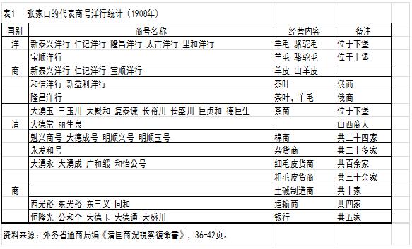 這份資料是因為(wei) 清日的貿易發展不振而對北京、張家口、保定、天津、滿州、錦州、盛京、牛莊、上海、無錫、蘇州、杭州、廈門、福州、寧波、泉州漳州、汕頭、澳門等地進行的調查,多以港口城市為(wei) 主,而內(nei) 陸的張家口也在其中,說明其貿易口岸地位之重要。從(cong) 以上的資料可以看出茶葉貿易和許檀分析的一致,清商在中俄的茶葉貿易上漸漸處於(yu) 不利的狀態,隻能經營年交易額500-600萬(wan) 兩(liang) 之中的四分之一部分,可是以十大商人利用各自在國內(nei) 和俄國的分號承攬了茶葉以外的大部分貿易,是有很大的經濟效益的。間接貿易中,外國商人借清人之名設立洋行,如後述所言,並不是隻是適應中國的商業(ye) 習(xi) 慣而采取的方法。漢蒙貿易應該說完全依靠晉商,旅蒙商等從(cong) 大到小的各種商人的商業(ye) 活動。隻按列舉(ju) 的數據合計,新泰興(xing) 、仁記、寶順三家洋行每年至少收購30萬(wan) 元以上的山羊羊皮褥。如表1的統計,至少有200家以上清商幾乎獨攬全部的貿易。1902年張家口的總體(ti) 貿易規模和附圖相對照可以看出,還是在貿易增長之中,還未減弱。