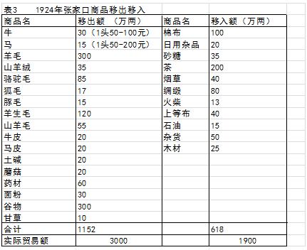 表2是1923年發表的,表3是南滿洲鐵道株式會(hui) 社庶務部調査課1924年的數據,對照看,張家口作為(wei) 北方物資集散地和陸路口岸地位是不變的。外國商品不斷進口,棉布、日用品、罐頭、海產(chan) 幹貨、化妝品等日美商品慢慢地被蒙漢人民所接受。同時作為(wei) 原料的蠶豆、豌豆、牛肉的也向日本出口。即使外蒙出現變亂(luan) 、張庫大道停止,但大宗的茶、毛皮等大宗商品為(wei) 主的土特產(chan) 品移出的格局並沒有改變,年交易額過千萬(wan) ,移出額超過移入額。