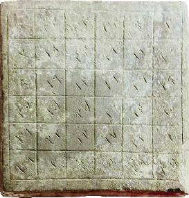 元中都於(yu) 大德十一年(1307 年)由元武宗海山開始修建,至正十七年(1357年)被紅巾軍(jun) 毀壞。元中都遺址位於(yu) 張北縣縣城西北15 公裏處,在今饅頭營鄉(xiang) 白城子、淖沿子和積善村之間。由河北省文物研究所、張家口市和張北縣文物部門聯合在1998年對其進行的考古發掘中,在一號大殿前殿北部中心出土了一件寬14.5 -14.7、高15.2 厘米,厚2.7-2.9 厘米的青石阿拉伯數碼六階幻方。陰刻縱橫各六道方格線,內(nei) 陰刻36 個(ge) 古阿拉伯數字。