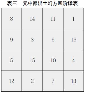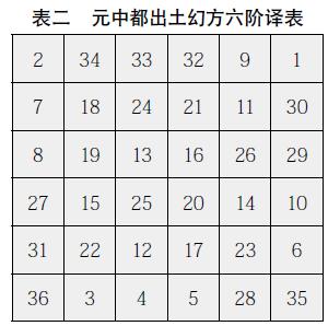 這個(ge) 六階幻方譯表(表二)中間套著一個(ge) 四階幻方(表三)。這個(ge) 四階幻方,其同行、同列、同一主對角線的數字之和均為(wei) 34。該四階幻方,稱之為(wei) 基礎幻方;該六階幻方,可稱之為(wei) 複形幻方。如果用擴階原則,可以通過基礎幻方構造出複形幻方,即該六階幻方。