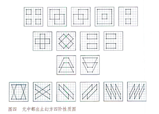 這個(ge) 四階幻方有許多優(you) 良的性質:除同行、同列、同一主對角線的數字之和均為(wei) 34以外,其正方四、對方四、中方一、角方一、周方二、中長方二、斜長方二、角長方四、梯形四、平行四邊形十四等各數字之和均為(wei) 34(圖四)。由此,可以看出四階幻方的構成,一線或一方的幻方常數的個(ge) 數有48 個(ge) 。