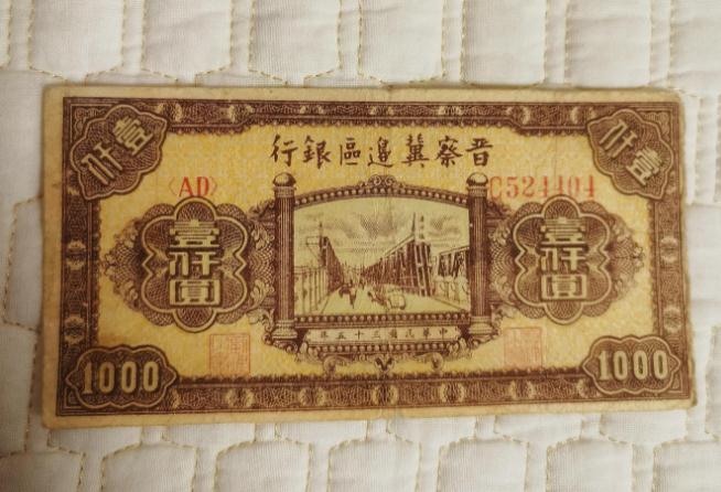 今晚,在妹妹家,欣賞妹夫的紙幣收藏,一枚晉察冀邊區的1000元紙幣,吸引了我的視線。雖也涉足收藏,但接觸錢幣不多,這枚有著通橋圖案的珍貴紙幣,還是我頭一次親(qin) 眼目睹。