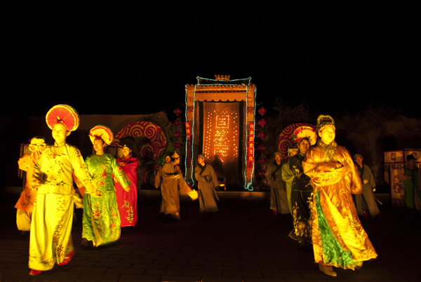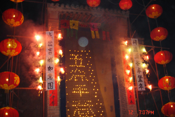 拜燈山的基本內(nei) 容有點燈山、拜燈山、耍社火、唱大戲等四部分。點燈山時,首先準備好祭祀供品和點燈山用的燈撚兒(er) 、燈盞、麻油等。點燈山的人由三到五名有文化的村民組成,在燈山樓內(nei) 層層木架上由上至下將數百個(ge) 燈盞擺出花邊兒(er) 和文字圖案,把浸過麻油的燈撚兒(er) 插入燈盞,一一注滿油。夜幕降臨(lin) 後,用蠟燭將擺成圖案的燈盞一一點燃,呈現出燈火字畫。拜燈山時,選一名父母雙全的男童扮成“燈官”,坐在由四名青壯年村民扮成“衙役”抬著的獨杆轎上,村裏戲班的演員化妝後伴其左右,在社火隊中“老王八”和“老媽子”的引領下,從(cong) 堡門外進堡,率村民及觀光者一路敲鑼打鼓到燈山樓前祭拜。拜燈山後,祭拜隊伍返回途中在堡中心伴隨鑼鼓點開始耍社火,或舞蹈,或嬉戲,表演者和觀眾(zhong) 沉浸在歡樂(le) 喜慶之中。最後是唱大戲,當祭拜隊伍和群眾(zhong) 由堡內(nei) 湧出堡外時,戲樓前已經張燈結彩,這時,鞭炮鳴,鼓樂(le) 起,大戲開,由村戲班子演員為(wei) 村民演繹曆史故事或神話傳(chuan) 說。