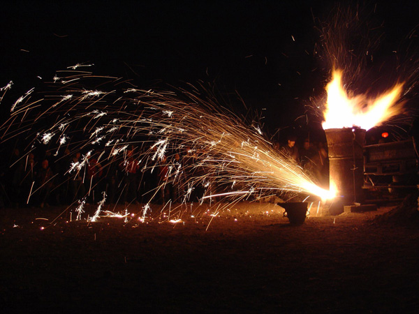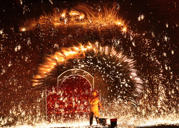 據說當年暖泉鎮有好多生鐵鑄造作坊,每逢年節,富人們(men) 燃放煙花慶祝,鐵匠們(men) 也同樣渴望著熱鬧喜慶。但鐵匠買(mai) 不起煙花,他們(men) 從(cong) 生鐵水注模時四濺的火花中得到靈感,把熔化的生鐵水潑灑到古堡城門上方的磚牆上,好似朵朵煙花盛開。這種特別的“煙花”吸引了越來越多的普通老百姓,其熱鬧喜慶的氛圍絕不輸給擁有煙花的富人們(men) 。因此,便有了每逢過年“富人放煙花、老百姓打樹花”的民間習(xi) 俗。