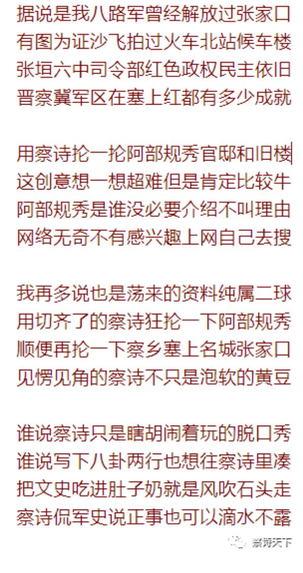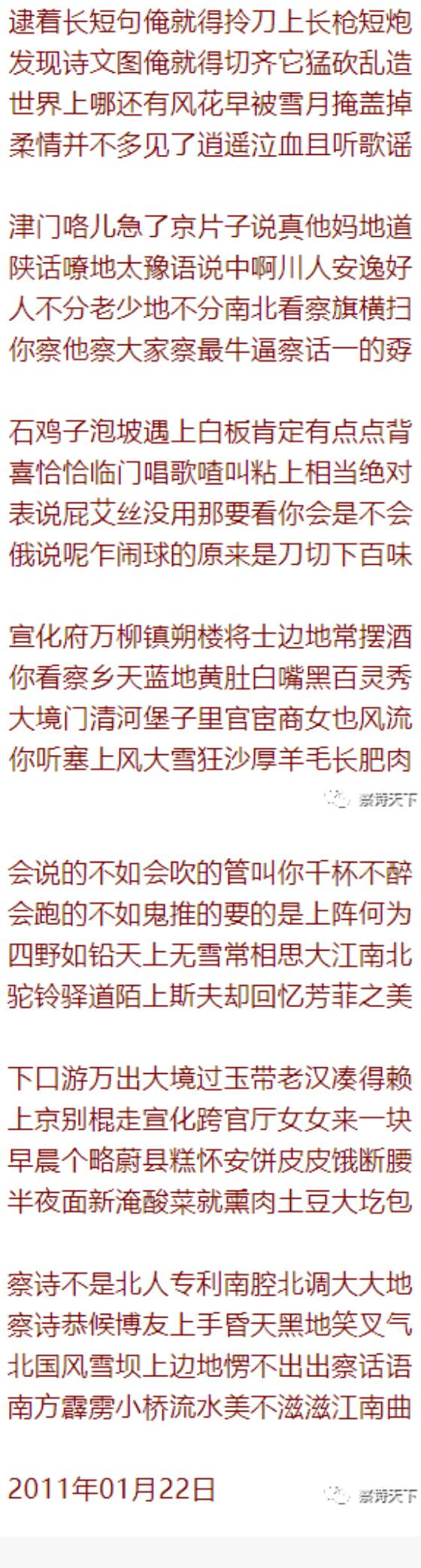 察,察哈爾也。察詩,於(yu) 2010年起,由著名實名製博客網站“博聯社”察哥蘭(lan) 草博客傳(chuan) 出,受到廣大詩友的推崇,並迅速在網絡詩壇走紅至今。中國第一本由察哥蘭(lan) 草創作的察詩詩集《我心向北》即將上市。