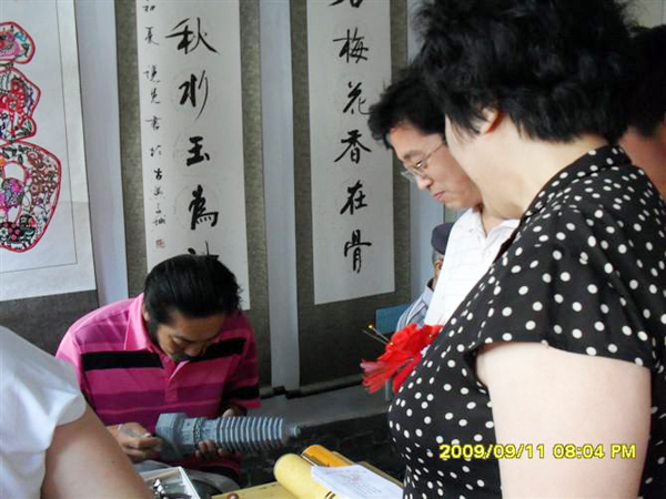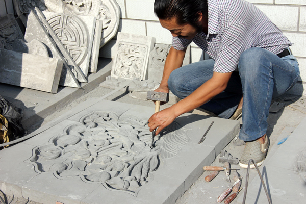 1993年,他學成回鄉(xiang) 。受朋友邀請為(wei) 本地一所寺廟成功雕刻了佛像,這是他第一次在家鄉(xiang) 寺廟做工,初露鋒芒便受到同行們(men) 的讚賞。這位有誌的年輕人,鍾情於(yu) 中國傳(chuan) 統的建築技藝和民間美術,經常利用工作之餘(yu) ,仔細地觀察古人巧奪天工的磚木石雕,屢屢被先人們(men) 的精湛技藝所折服,被精美的藝術造型所吸引。心中悄然立誌:一定要傳(chuan) 承先輩們(men) 留給我們(men) 的寶貴財富,絕不能讓磚雕這門技藝在我們(men) 這一代人手中失傳(chuan) 。
