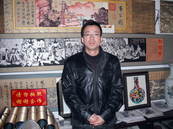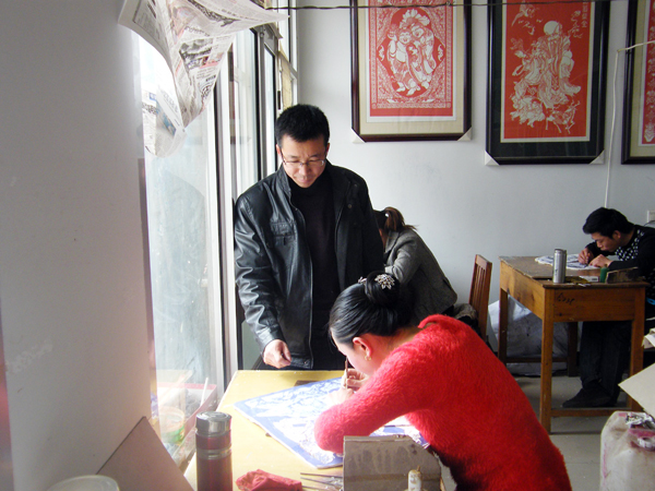 2000年,劉海濱創建了“藝賞軒剪紙廠”,現有剪紙藝人及工作人員28名,形成了從(cong) 設計、刻製、染色到裝裱的一條龍專(zhuan) 業(ye) 化規模經營。剪紙種類有畫冊(ce) 、鏡框剪紙、掛軸等,剪紙題材有花鳥、人物、節慶、臉譜等。剪紙廠的剪紙產(chan) 品由原來的幾十種擴大到幾百種,滿足了市場高標準、大批量供應,產(chan) 品遠銷40多個(ge) 國家和地區,為(wei) 振興(xing) 蔚縣剪紙文化藝術和繁榮蔚縣經濟做出了貢獻。