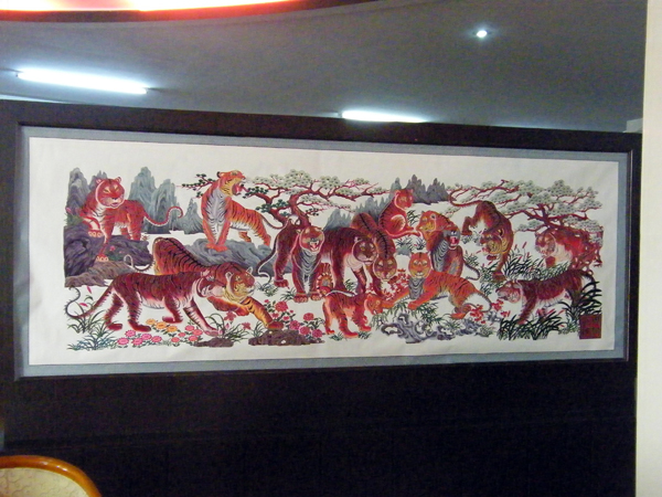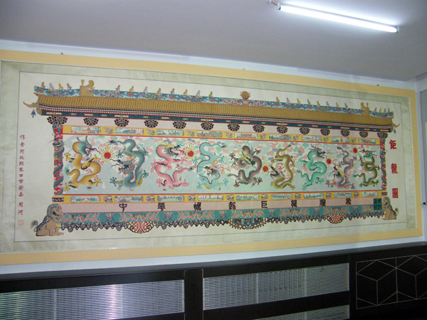 周河的剪紙越做越大,由開始的四開、對開、整張宣紙到數張宣紙連續。特別是創作了長5米、高1.6米的《巨龍圖》巨幅剪紙作品,堪稱剪紙之最。被香港《大公報》、《文匯報》等多家媒體(ti) 報道。該作品獲多項獎勵,並被北京人民大會(hui) 堂收藏。
