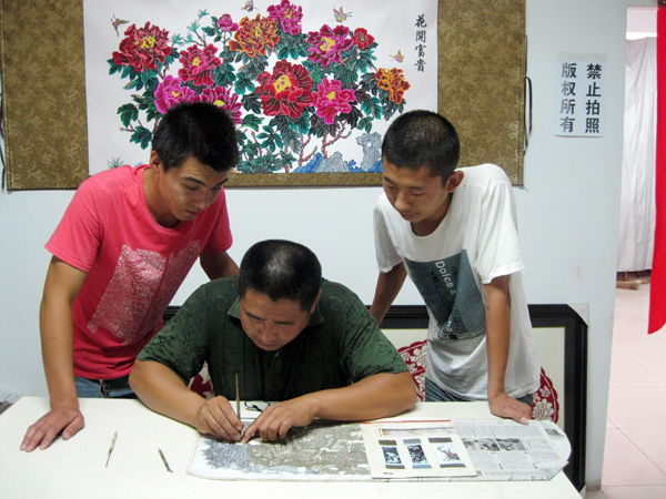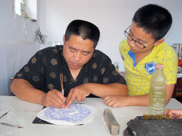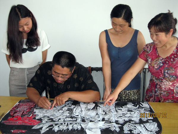 他自幼受家庭環境的熏陶,跟父親(qin) 王峰學習(xi) 設計創作剪紙,走南闖北的推銷剪紙,推廣剪紙藝術。他認真向母親(qin) 學習(xi) 剪紙的點彩技藝,向哥哥學習(xi) 剪紙的雕刻技藝,在大學期間就已經掌握了蔚縣剪紙設計、刻製、染色的全套技法。大學畢業(ye) 後他跟著父親(qin) 經常參加一些展覽展銷會(hui) ,去推銷和推廣蔚縣剪紙,取得了一些社會(hui) 效益和經濟效益。